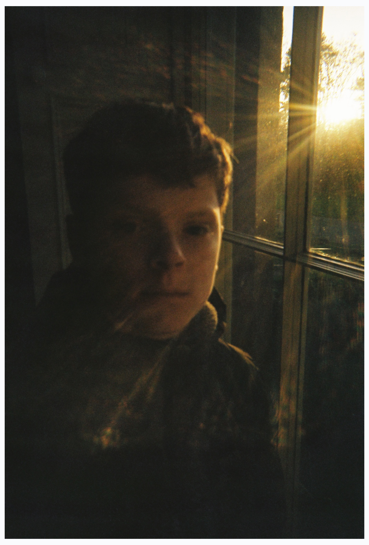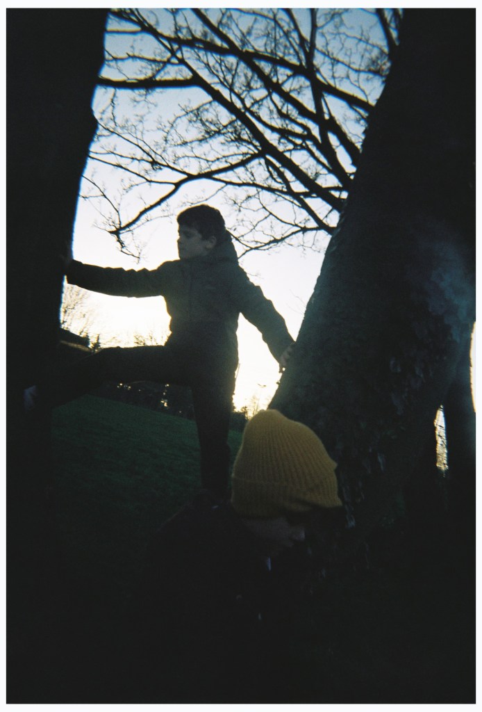 In one image, my son stands close to a window, his face spilt between darkness and the last light of the day. The glass becomes a surface of reflection and separation, enclosing us in an interior space while letting in the outside world. In the other my sons move between bare trees, their bodies silhouetted against a pale winter sky. This season brings a slowing down as we spend less time outdoors, but with this there is also a heightened awareness: of time passing, decay and the promise of renewal.